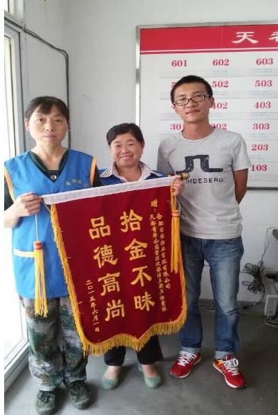 6月10日下午,居住在经开区天都公寓的1#楼的胡海青来到公寓物业办,将一面上书“拾金不昧品德高尚”的锦旗,送到两位保洁大姐王新玉和杨素琼手中,并连声道谢。